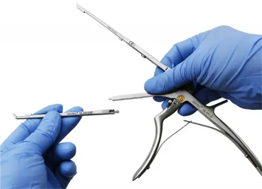 Для решения описанной выше проблемы мы разработали новый инструмент для ламинэктомии — «TIP-EX punch — пуансон со сменными наконечниками».